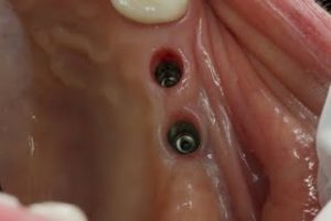 歯茎に穴があいた写真をご覧ください。歯肉に炎症が全く認められず、とてもきれいな色をしています。真ん中の写真は土台を立てたところ。チタン製です。