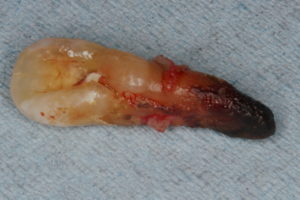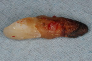 上の写真は、その歯を抜いたものです。左の写真に歯の根にひびが入っているのがお分かり頂けますか?おそらく、このひび割れから感染が広がり、ご覧のように真っ黒な細菌が繁殖した歯石がこびりついてしまったのではないかと考えられます。