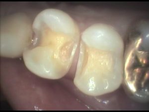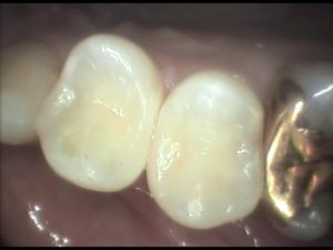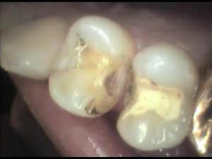 この患者さんは銀歯が外れたのですが、白い詰め物で治して欲しいとのことで来院されました。見てみると、1本金属の詰め物が外れています。手前にも金属が入っていますが、同時期に処置したものなので、近い将来同じように外れてしまう可能性が高く、一緒にやり直すことにしました。