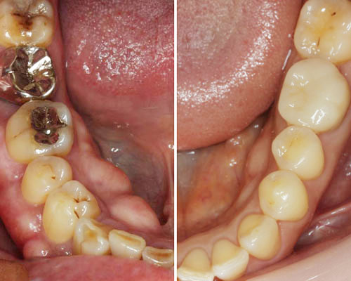 皆さんも鏡でお口の中を確認してみて下さい。舌の下に豆のような出っ張りが左右対称にありませんか?写真の右が正常、左が「外骨症」と呼ばれる骨隆起です。よく見かける症状で悪いものではありませんが・歯ぎしりや食いしばりが原因だと言われています。