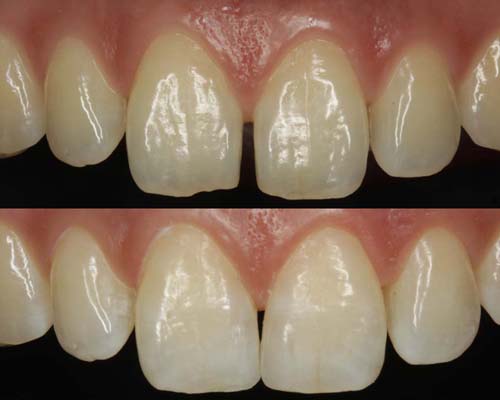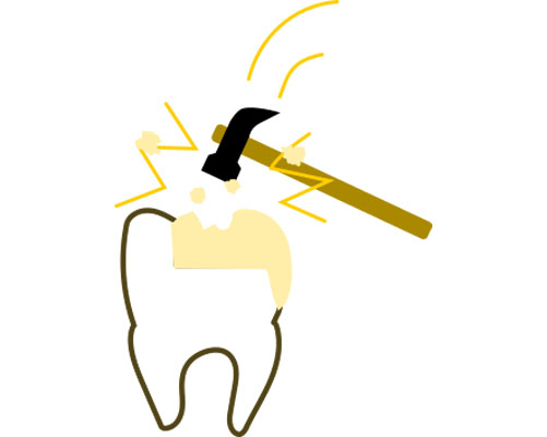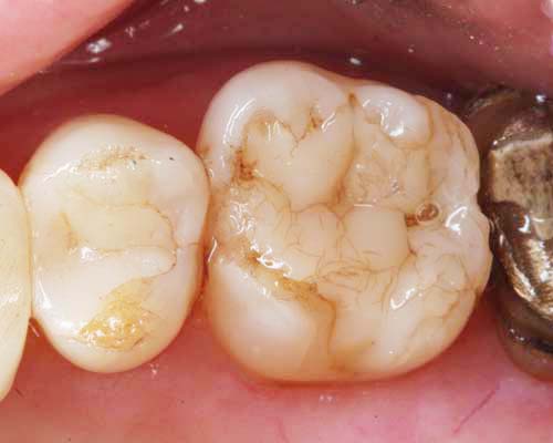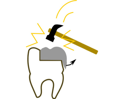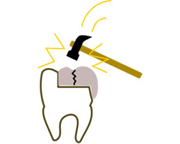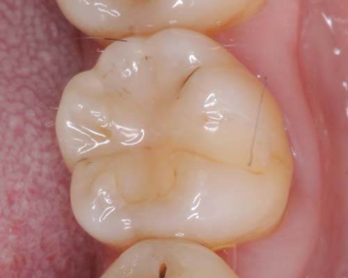 現在考えられる最良の虫歯治療 ダイレクトボンディングを検証 健康な歯をなるべく削らない治療法は? なぜダイレクトボンディングが接着面の保護に優れているのか ダイレクトボンディングの気になる耐久性 ダイレクトボンディングは綺麗に仕上がるのか。審美性を検証 健康な歯をなるべく削らない治療は? 削る量を比較 虫歯を削って「金属」や「セラミック」を詰めるステップが上の段、プラスティックを詰めるのが下の段になります。プラスティックは虫歯だけを削り取れば済みますが、金属やセラミックは一塊で詰める必要があるためかなり大きく削らなければなりません。また、型を取って模型上で作るため治療は2回かかります。 接着面の保護に適した材料 歯に詰めるプラスティックの構造 プラスティックと言っても、身の回りにあるプラスティクとは違います。セラミックの小さな粒子が石ころみたいにゴロゴロしていて、それをプラスティック(樹脂)で固めたものが歯科で使うプラスティクです。セラミックが入っているので、摩耗に強く、プラスティックで補強してあるので粘りがあります。その為ハイブリッドセラミックとも呼ばれています。 歯を削った面の保護が大切 虫歯治療で大切なのは、「虫歯を完全に削り」「削った面を保護する」ことがとても重要です。では削った面を保護するのは何か?「接着剤」です。次に「接着剤を長持ちさせる」にはどうしたら良いか?「力を加えない」ようにすれば良いのです。ではどうやって?残念ながら奥歯では常に力が加わります。ならば、「接着面に負担のかかりにくい材料」を探しましょう。 金属 歯に衝撃を加えた時、接着面に一番衝撃が伝わりやすいのが金属です。熱による膨張収縮もあります。叩かれていると変形してきます。また、接着剤との相性もそれほど良いものではありません。そのため、一番接着面が壊れやすいのが金属です。さらに問題なのは、光を通さないため金属の裏側の様子がわからず、虫歯が始まっても確認できないことです。 セラミック セラミックも、接着面に衝撃を伝えやすい材料です。ただ、変形や熱による膨張収縮はほとんどありません。残念なのは、接着剤との相性が非常に悪いのが欠点です。セラミックによく付く接着剤がないのです。もう一つの欠点は割れやすいという事です。ただ、割れる時は何かしらトラブルが起こった時ですので、歯より先に割れてくれれば、歯は守られるという考え方もできます。 プラスティック(ハイブリッドセラミック) プラスティックは、他の材料に比べ柔らかいため接着面に一番衝撃を伝えにくい材質です。熱や衝撃による変形はほとんどありません。何より大きなメリットは、接着剤との相性がいいことです。現在、接着剤はプラスティック系のものが主流で、当然良く付きます。というより、そもそもセラミックの粒子を樹脂で固めたものなので、セラミックの粒子が入った接着剤と考えることもできます。 金属、セラミック、プラスティックを詰めた時、お口の中の環境を再現して比べてみましょう。 衝撃の伝導 熱膨張 変形 接着性 強度 金属 × × × △ ◎ セラミック × ◎ ◎ × ◯ プラスティック ◎ ◎ ◎ ◎ △ 衝撃の伝導というのは、噛んだ時に接着面に衝撃が伝わりやすいものをバツとしました。接着面に負担がかからないのは、衝撃が伝わりにくく、歪みが少ない方が有利です。 耐久性 治療後18年経過 18年前の治療です。ほとんど問題ありません。プラスティックといっても、セラミックの細かい粒子を樹脂で固めたものですので、耐久性も備えています。ハイブリッドセラミックと言われる所以でもあります。 治療後3年 僅か3年でこのような状態になっていました。このような症例は稀ですが、耐久性に不安が残る一つの証拠です。ただ、よく観察してみると細かいヒビが入っているのは、修復した箇所だけではなく、エナメル質にも無数のヒビが入っています。おそらく、食いしばりや歯軋りの著しい方だと思われます。セラミックを入れても同じような結果になった可能性はあります。 審美性 隙間を埋めた症例 歯と歯の隙間が気になるとのことで、ダイレクトボンディングで隙間を埋めました。歯を削ることもなく、僅か1時間で終わりました。このように、プラスティックを詰めた痕跡が分からないほど、審美的に仕上げることができます。もちろん、きれいに仕上げるためには高い技術を必要とします。