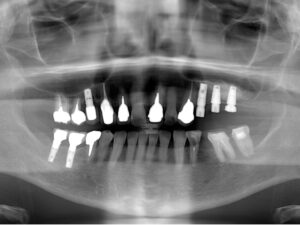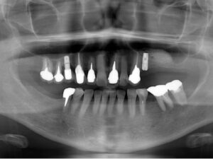 写真は治療前骨の厚みが1mm以下だったところ、上顎洞挙上術で1cm程度の骨の厚みになり、9mmのインプラントを入れた。その後半年待ってから上部構造を入れた。