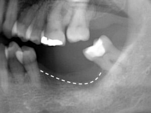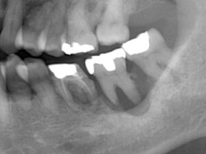 奥の2本が根の周囲の骨が歯周病で溶けてしまい、ぐらぐらしていた。歯周病治療で残すことは難しいと判断し、抜歯した。抜歯後、骨が吸収しているためそのままインプラントを入れると長い歯になってしまうため骨造成が必要と診断