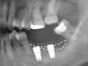 骨造成前より垂直的に骨が再生し、インプラントを高い位置に入れる事ができたため、極端に長い歯にならずに済んだ。術後10年経過しているがトラブルはない。