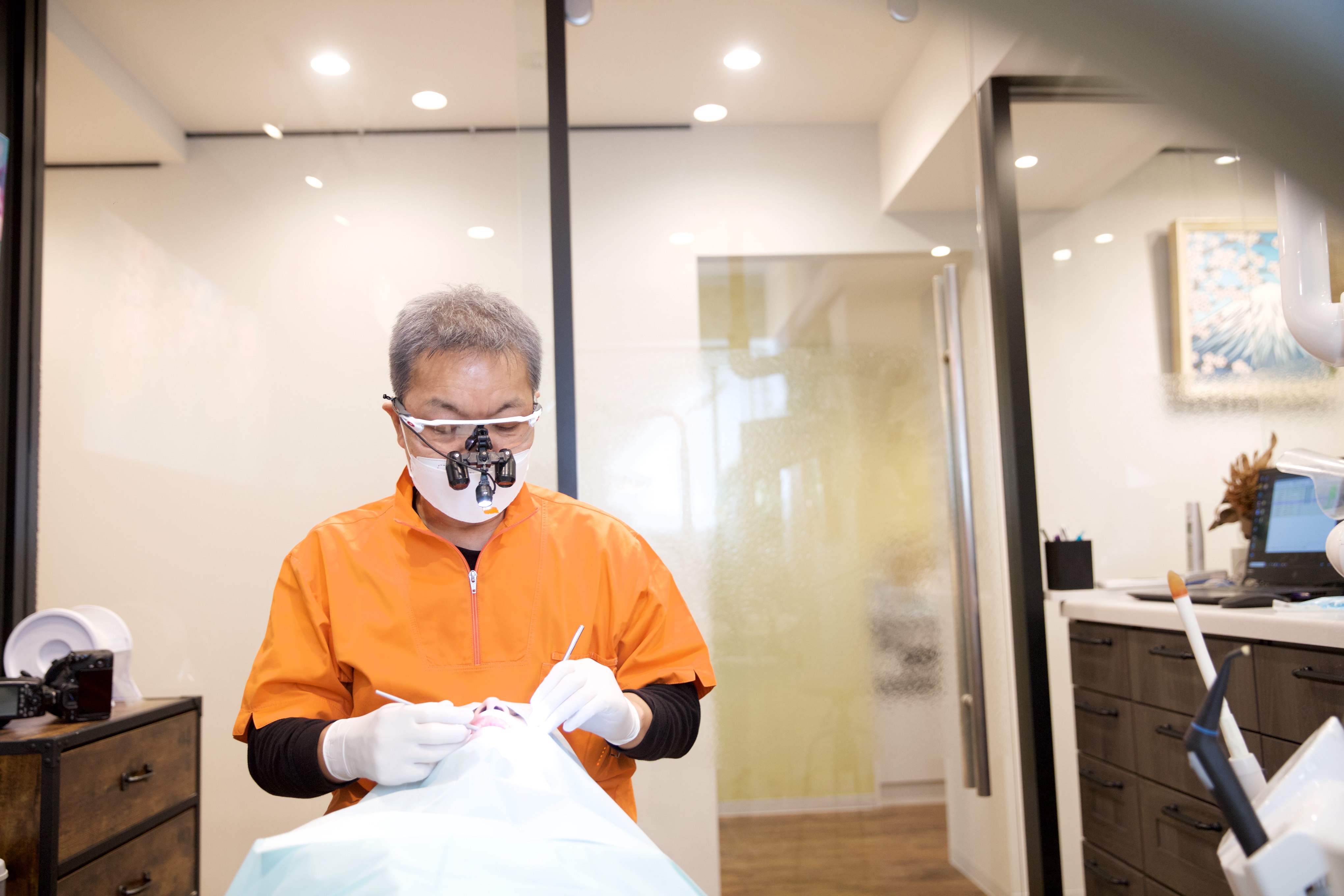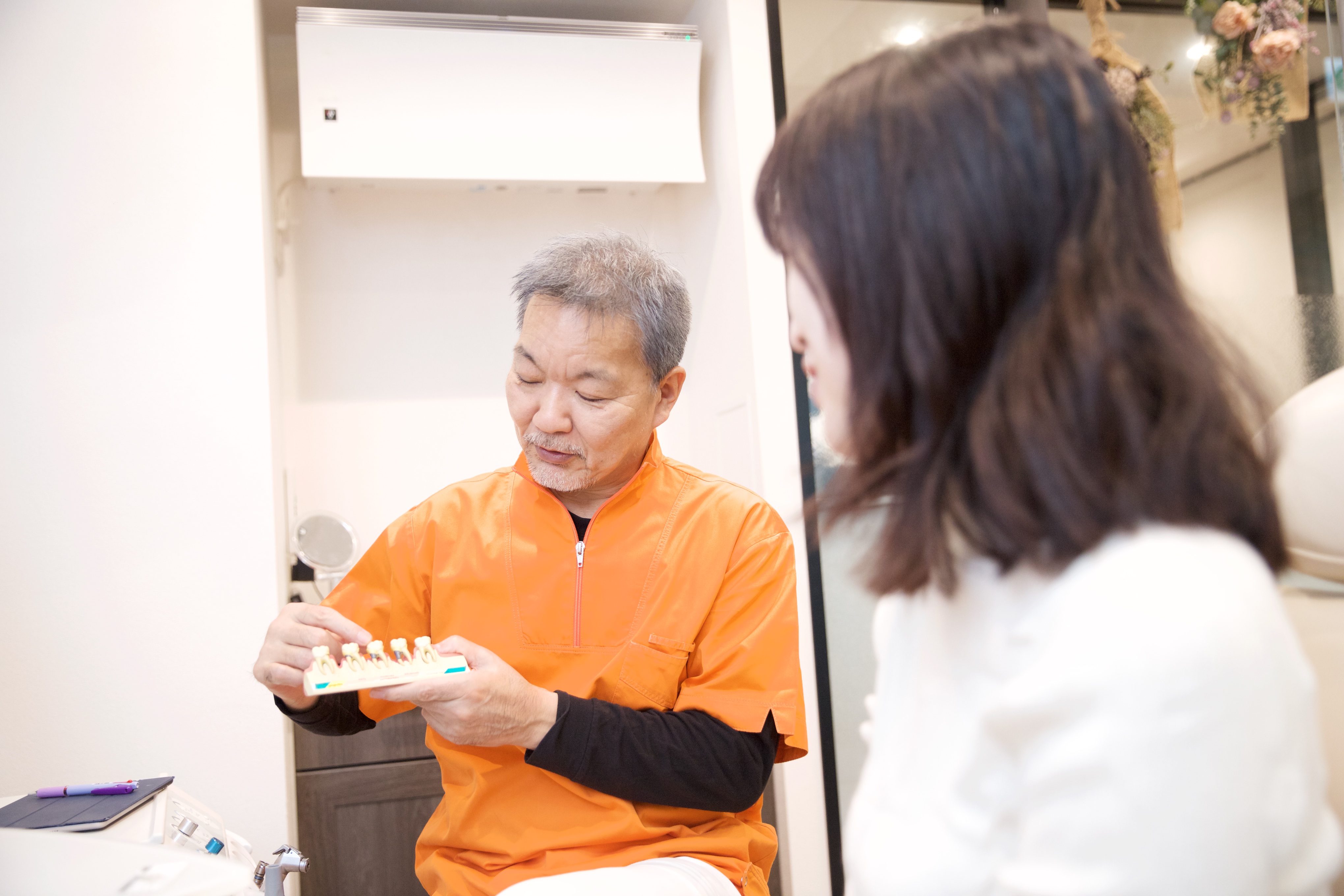 ウォーキングブリーチとは ウォーキングブリーチは、神経を取った歯が変色してしまった場合に、歯を白くする治療法です。歯の内側に漂白剤を入れて密閉し、内部から徐々に白くしていきます。歯を削ることなく、変色した歯を自然な白さに戻すことができます。 神経を取った歯は、時間が経つにつれて徐々に変色し、黒ずんだり、灰色がかったりすることがあります。特に前歯が変色すると、笑ったときに目立ってしまい、審美的な問題となります。 通常のホワイトニングは、歯の表面から薬剤を浸透させる方法ですが、神経のない歯には効果が出にくいことがあります。ウォーキングブリーチは、歯の内側から直接作用させるため、神経のない歯でも効果的に白くすることができます。 神経を取った歯が変色する理由 神経を取る治療(根管治療)で血液や結合組織などの軟組織がきれいに取り除かれていないと、象牙質の細い管の中に汚れが浸透していきます。そのため、歯の内部が徐々に変性し、色が変わっていきます。治療後すぐには変化が見られなくても、数年かけて少しずつ変色していくことが多いです。 前歯が変色すると、口元の印象が大きく変わってしまいます。笑顔に自信が持てなくなったり、人前で話すことに抵抗を感じたりする方もいらっしゃいます。ウォーキングブリーチは、そうした審美的な悩みを解決する有効な方法です。 ウォーキングブリーチが適している症例 少なくとも2/3以上健康な歯質が残っていて、噛み合わせが強くない場合に適しています。特に、前歯が他と比べて黒ずんでいて目立つという症例に効果的です。たくさん歯を削りたくないが、色が気になるという場合に向いています。 外傷で神経が死んでしまった歯や、虫歯治療で神経を取った歯の変色に対応できます。軽度から中等度の変色であれば、良好な結果が期待できます。 ただし、重度の変色や、テトラサイクリン系の抗生物質による変色には、効果が出にくいことがあります。また、歯の内部に大きな金属の土台が入っている場合や、歯質が極端に薄い場合は、適応外となることがあります。 当院のウォーキングブリーチにおける特徴 歯を削らない審美治療 ウォーキングブリーチは、歯を削ることなく白くできる治療法です。被せ物を作るためには、歯を大きく削る必要がありますが、ウォーキングブリーチなら歯質を保存できます。 当院では、MI治療(Minimal Intervention:最小限の侵襲)を基本としており、歯を削る量を可能な限り少なくすることを心がけています。ウォーキングブリーチは、この理念に合致した治療法です。 マイクロスコープによる精密処置 当院では、マイクロスコープを導入しており、ウォーキングブリーチの際にも活用しています。歯の内部の状態を拡大して確認しながら処置を行うことで、より安全で確実な治療が可能です。 根管治療が適切に行われているか、充填材がしっかりと封鎖されているかを確認します。問題がある場合は、先に根管治療をやり直してから、ウォーキングブリーチを行います。 丁寧なカウンセリングと経過観察 治療を始める前に、現在の歯の色を記録し、ご希望の白さについてお伺いします。周囲の歯と調和する自然な白さを目指します。 治療期間中は、定期的に通院していただき、色の変化を確認します。ご希望の白さになったら治療を終了し、最終的な仕上がりをチェックします。 良心的な価格設定 当院のウォーキングブリーチは、1本33,000円で提供しています。被せ物を作るよりも費用を抑えられ、歯質も保存できるため、コストパフォーマンスに優れた治療法です。 ウォーキングブリーチの流れ 初診時には、お口の状態を確認し、変色の程度や原因を診断します。レントゲン撮影で、根管治療が適切に行われているかを確認します。根管に問題がある場合は、先に再治療を行う必要があります。 治療当日は、歯の裏側から小さな穴を開け、古い充填材を一部除去します。根管の先端部分はしっかりと封鎖したまま、歯の内部に漂白剤を入れます。漂白剤を入れたら、仮の蓋で密閉します。 1週間から2週間ごとに通院していただき、漂白剤を交換します。徐々に歯が白くなっていく様子を確認しながら、治療を進めます。通常は、1回から3回程度の薬剤交換で、ご希望の白さになります。 ご希望の白さになったら、漂白剤を取り除き、歯の内部をしっかりと清掃します。最終的な充填材で封鎖し、歯の裏側の穴を詰めて治療完了です。 ウォーキングブリーチの期間と回数 治療期間は、変色の程度やご希望の白さによって異なりますが、通常は1か月から2か月程度です。1週間から2週間ごとに通院していただき、薬剤を交換します。 軽度の変色であれば、1回で十分な効果が得られることもあります。中等度の変色では、2回から3回の交換が必要になることが多いです。 重度の変色では、3回を限度としています。経験上、無闇に回数を重ねても改善することはありません
