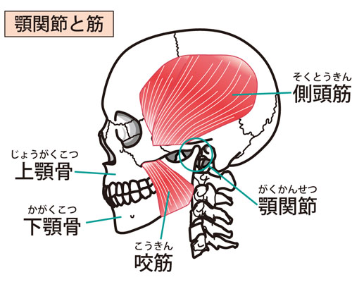あごの症状 こんな症状はありませんか? ・口を開ける時や閉じる時にあごに痛みを感じる ・あごの動きが悪く、大きく口を開けることができない(人差し指、中指、薬指の3本分縦に揃えて入れられない) ・あごを動かすと音がする ・こめかみや頬、耳の前に痛みを感じる ・かみ合わせが変わったと感じる このような症状を慢性的に抱えている方はいらっしゃいませんか?これらの症状が出る方は、ひょっとすると顎関節症かもしれません。 顎関節症とは? ◯◯症と名付けられているものは、ある特定の病態、症状、原因を指すものではなく、多様な病態、症状、原因からなる障害のことをまとめた病名です。そのため、上記のような顎関節やあごを動かす筋肉の障害をまとめて顎関節症と呼んでいます。 顎関節症の病態として、あごを動かす筋肉の障害と顎関節の障害、顎の骨の変形などがありますが、それらが必ずしも単独で発症しているとは限らず、複合していることが多々あります。 顎関節症の原因と治療法 他の病気との見分け方 特徴としては、口を開けるたり閉じたりする動作をした時に症状が出て、顎を動かしていない時には症状がありません。顎関節症とよく間違われるのが、耳下腺炎や智歯周囲炎(親知らずの周囲の炎症)などですが、これらはじっとしていても痛みがあります。また、これらは感染による炎症ですから抗菌剤で良くなりますが、顎関節症は、感染が原因ではないため抗菌剤では良くなりません。 顎関節症を引き起こす因子は? ・歯ぎしりや食いしばりがある ・いつも右で噛んでいたり、左で噛んでいたりと偏っている ・ガムをよく噛んでいる ・うつぶせで寝ている ・吹奏楽器などの演奏や長時間歌を歌う行為 など、あごに負担のかかることを長時間行っているの主な原因として挙げられます。特に、歯ぎしりや食いしばりは長時間にわたってあごに負担をかけてしまうため、顎関節症になった方の8割に認められています。 治療法 基本的にはカウンセリングであごに負担が掛かっている因子を見つけ出し、それを取り除くように心がけてもらうことで7~8割近くが改善されます。カウンセリングで改善しない場合は、マウスピースを使って顎にかかる負荷を少なくします。また、痛みがひどい場合は、痛み止めで抑えます。ただ、膝や肘などの関節の損傷と同じように顎関節が損傷を受けてしまうと、症状が改善されても顎関節が元に戻る訳ではありません。 歯ぎしり食いしばりを予防法 歯ぎしりと食いしばりは顎関節症の一番の要因です。特に日中は、かみしめを行わないよう心がけましょう。日中のかみしめ癖は心がけ次第で治すことができます。歯ぎしり食いしばりについては、こちらをご覧ください。 歯ぎしり食いしばり あごが変だなと思ったらすぐ受診を 顎関節症は、痛みや違和感が少ないものが多く、そのまま放置してしまう患者さんが多くいらっしゃいます。しかしながら、いったん顎関節を損傷してしまうと完全に元には戻りません。あごに違和感を感じたら自己判断せずに、一度受診していただくことをお勧めします。 こんな治療は要注意 以前は、かみ合わせが悪いのが原因だと言われたこともありましたが、今では一つの因子に過ぎないと言われています。多くが、カウンセリングのような保存療法で改善することから、かみ合わせの調整などを初めから行う事はありません。また、整体などであごをボキボキと動かしたり、首や背骨の曲がりを矯正するといった施術を見かけますが、今のところ科学的根拠はありません。 あごを動かすと音がしたり口を開けづらくなるのはなぜ? 関節円板 顎関節では、下あごの後ろの部分の突起とそれを受けている頭蓋骨の凹みが合わさっていますが、骨と骨がゴリゴリと擦れているわけではなく、関節円板と呼ばれる繊維製の組織がクッションの役割をしてスムースに動くようになっています。 あごがカックンとなる仕組み この関節円板の位置がズレてしまうと、あごを動かした時にカクッと音がします。関節円板が傷ついているとジャリジャリと感じます。関節円板が前にずれたままだと口を開けることができません。