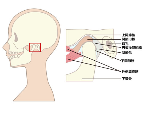 関節円板 顎関節では、下あごの後ろの部分の突起とそれを受けている頭蓋骨の凹みが合わさっていますが、骨と骨がゴリゴリと擦れているわけではなく、関節円板と呼ばれる繊維製の組織がクッションの役割をしてスムースに動くようになっています。