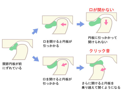 あごがカックンとなる仕組み この関節円板の位置がズレてしまうと、あごを動かした時にカクッと音がします。関節円板が傷ついているとジャリジャリと感じます。関節円板が前にずれたままだと口を開けることができません。