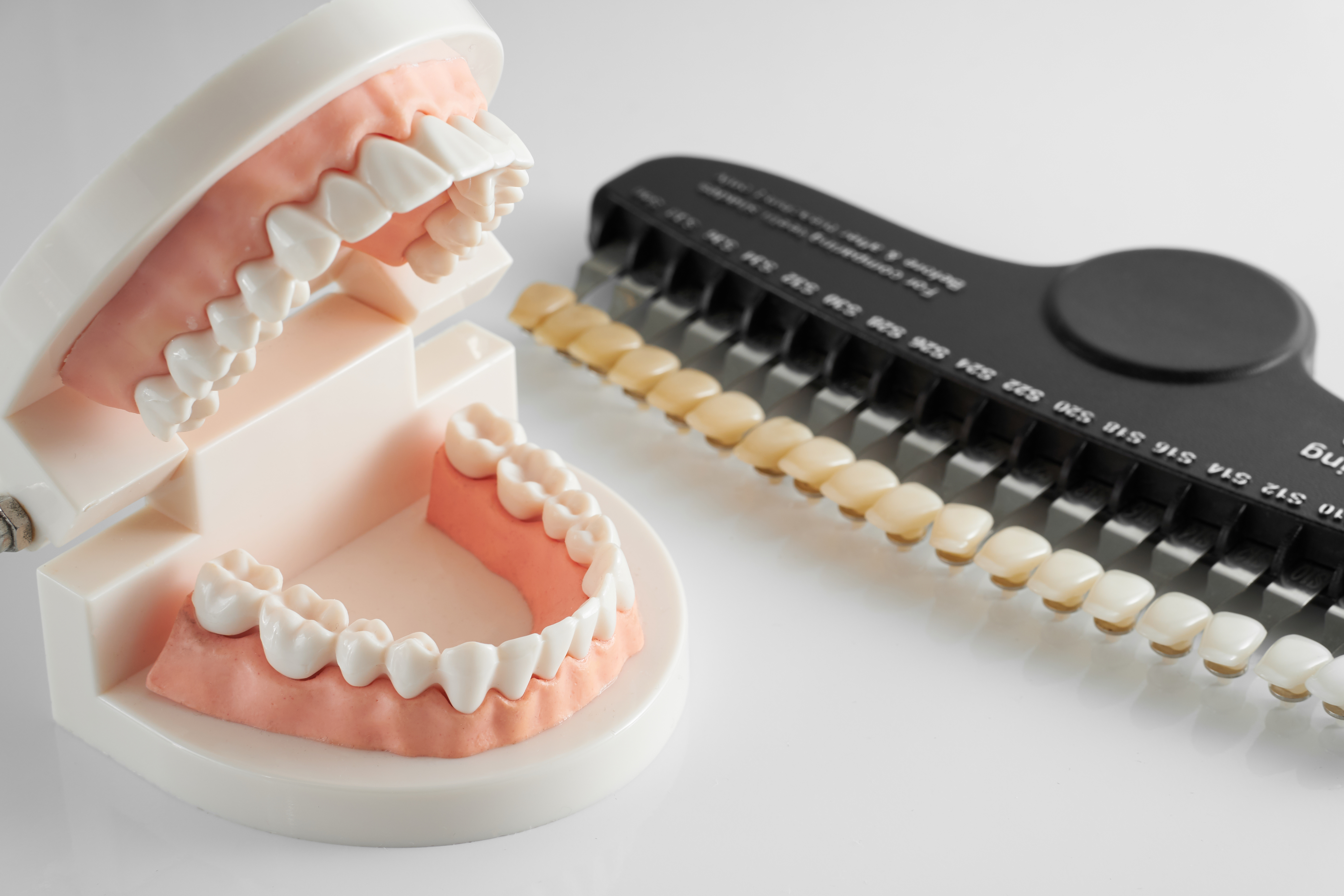 歯のホワイトニングは、専用のホワイトニング剤を使用して、歯を削ることなく、白く輝く歯にする方法です。ホワイトニング剤に含まれる成分の働きにより、歯の着色成分である有機質を分解。これらを無色透明の物質にすることにより歯を白くすることができます。